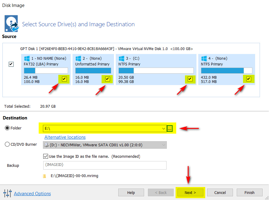 - В открывшемся мастере создания резервных копий будут определены в зависимости от установленной операционной системы Windows разделы для резервного копирования. В данном примере имеется 3 скрытых раздела (раздел восстановления Windows – 517 Мб, MSR раздел - 16 Мб и шифрованный (EFI) раздел – 100 Мб), а также непосредственно сам системный раздел.