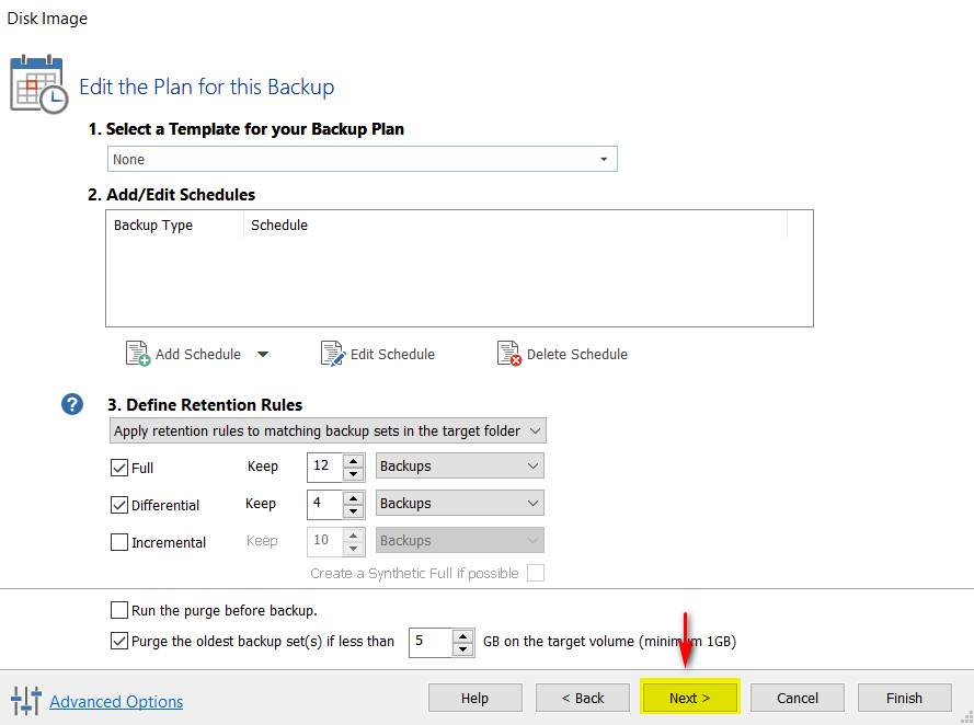 - В следующем окне мастера Edit the Plan for this Backup в разделе Select a Template for your Backup Plan в раскрывающемся списке можно выбрать нужный шаблон расписания и способа резервного копирования или оставить значение по умолчанию None.