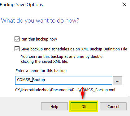 - Чтобы запустить процесс создания резервной копии, в открывшемся окне What do you want to do now проверить, чтобы был установлен флажок в чекбоксе Run this backup now (запустить резервное копирование сейчас) и нажать кнопку OK. Если установлен флажок в чекбоксе Save backup and schedules as an XML Backup Definition Files, можно сохранить заданные параметры для резервного копирования в отдельный .xml файл, чтобы можно было запускать резервное копирование с заданными параметрами по требованию, редактировать и др.