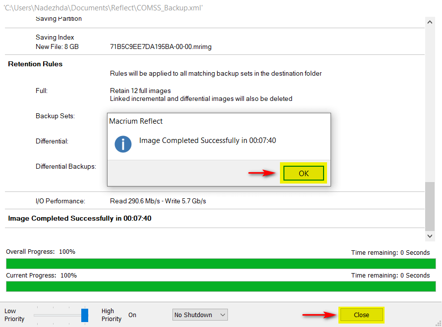 - По окончании резервного копирования система оповестит о том, что резервное копирования выполнено. Нажать кнопку ОК > Close.