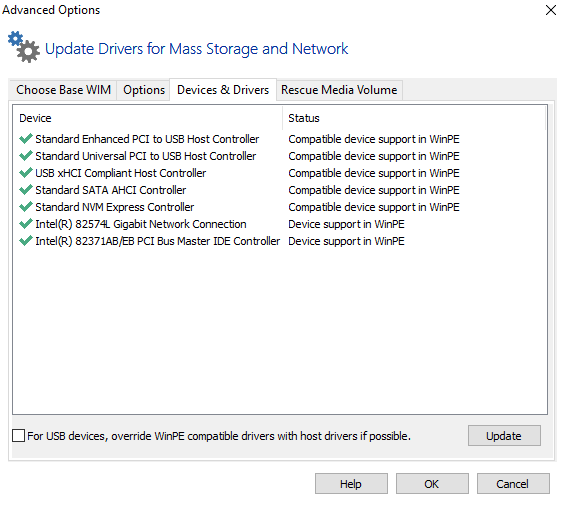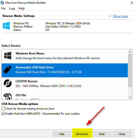 Чтобы открыть настройки для выбора дополнительных функция для создаваемого загрузочного носителя, iso образа или среды восстановления, которая будет доступна при загрузке, необходимо нажать кнопку Advanced.