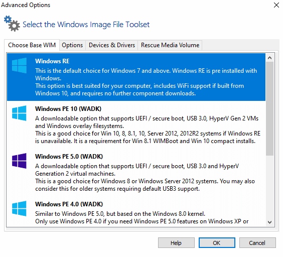 На вкладке Choose Base Wim можно выбрать наиболее подходящую среду Windows.