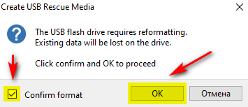 В открывшемся окне Create USB Rescue Media необходимо установить флажок в чекбоксе Confirm format и нажать ОК.