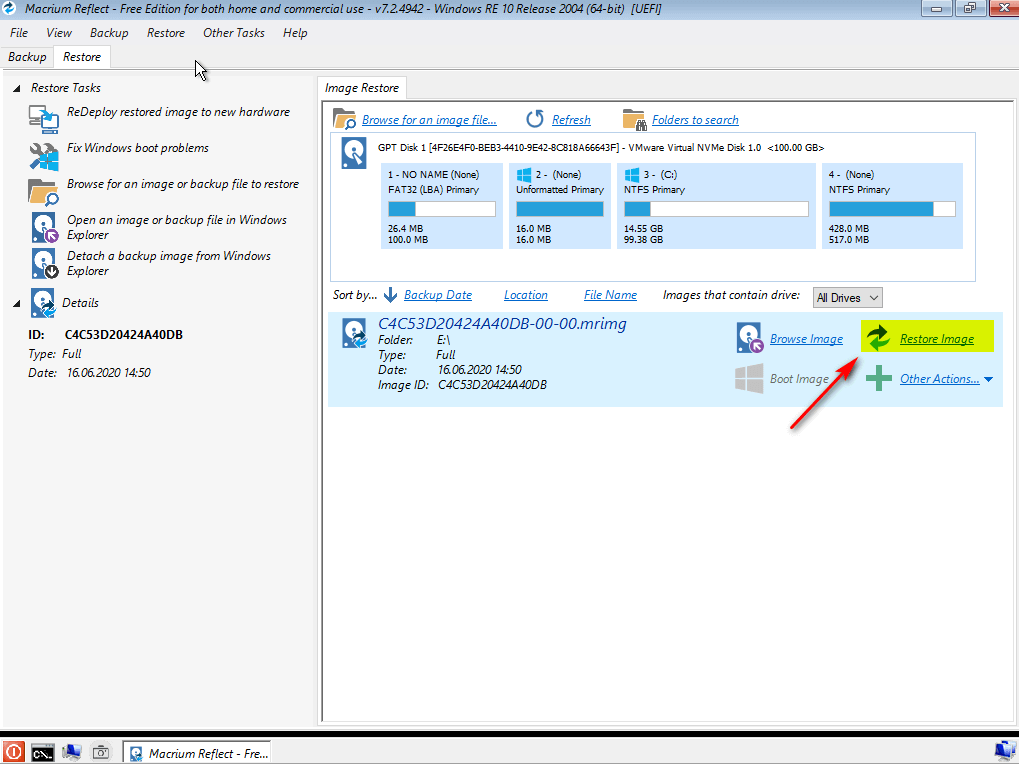 - В главном окне программы Macrium Reflect выбрать резервную копию, которую необходимо восстановить и нажать Restore Image (восстановление образа).