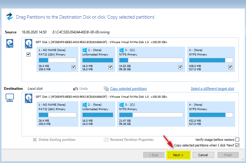 - В окне Drag Partitions to the Destination Disk or click Copy selected partitions (перетащить разделы на целевой диск или копировать выбранные разделы) оставить флажок в чекбоксе Copy selected partitions when I click Next, чтобы выбранные разделы были скопированы после нажатия на кнопку Next. Если необходимо восстановить резервную копию на другой диск, можно выбрать Select a different target disk и указать нужный диск. Также можно установить флажок в чекбоксе Verify image before restore, чтобы перед процессом восстановления был проверен образ резервной копии.