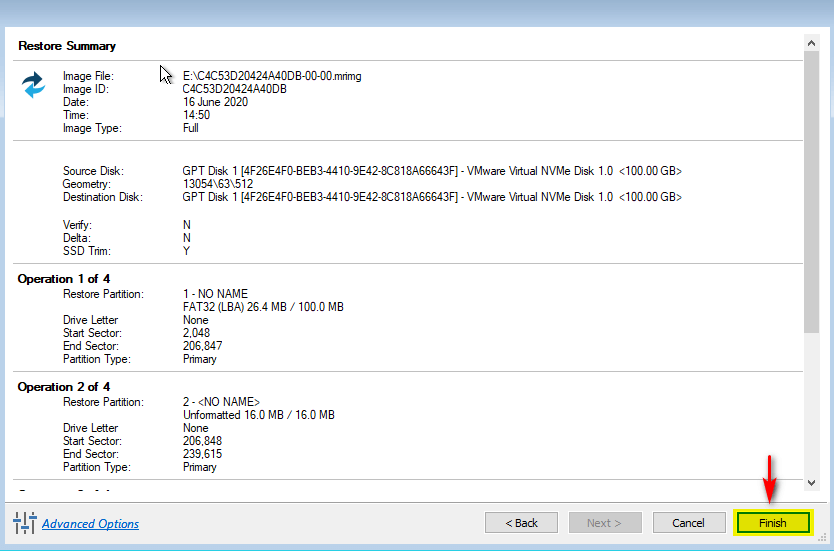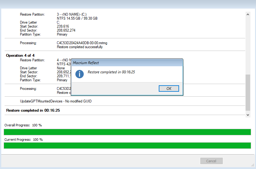 По окончании процесса восстановления резервной копии нажать кнопку ОK. Перезагрузить компьютер и выставить приоритет загрузки в BIOS/UEFI в исходное состояние.