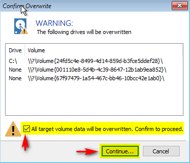 Во всплывающем окне Confirm Overwrite необходимо подтвердить перезапись существующих разделов, установив флажок в чекбоксе All target volume data will be overwritten. Confirm to proceed и нажать Continue для продолжения процесса восстановления резервной копии.