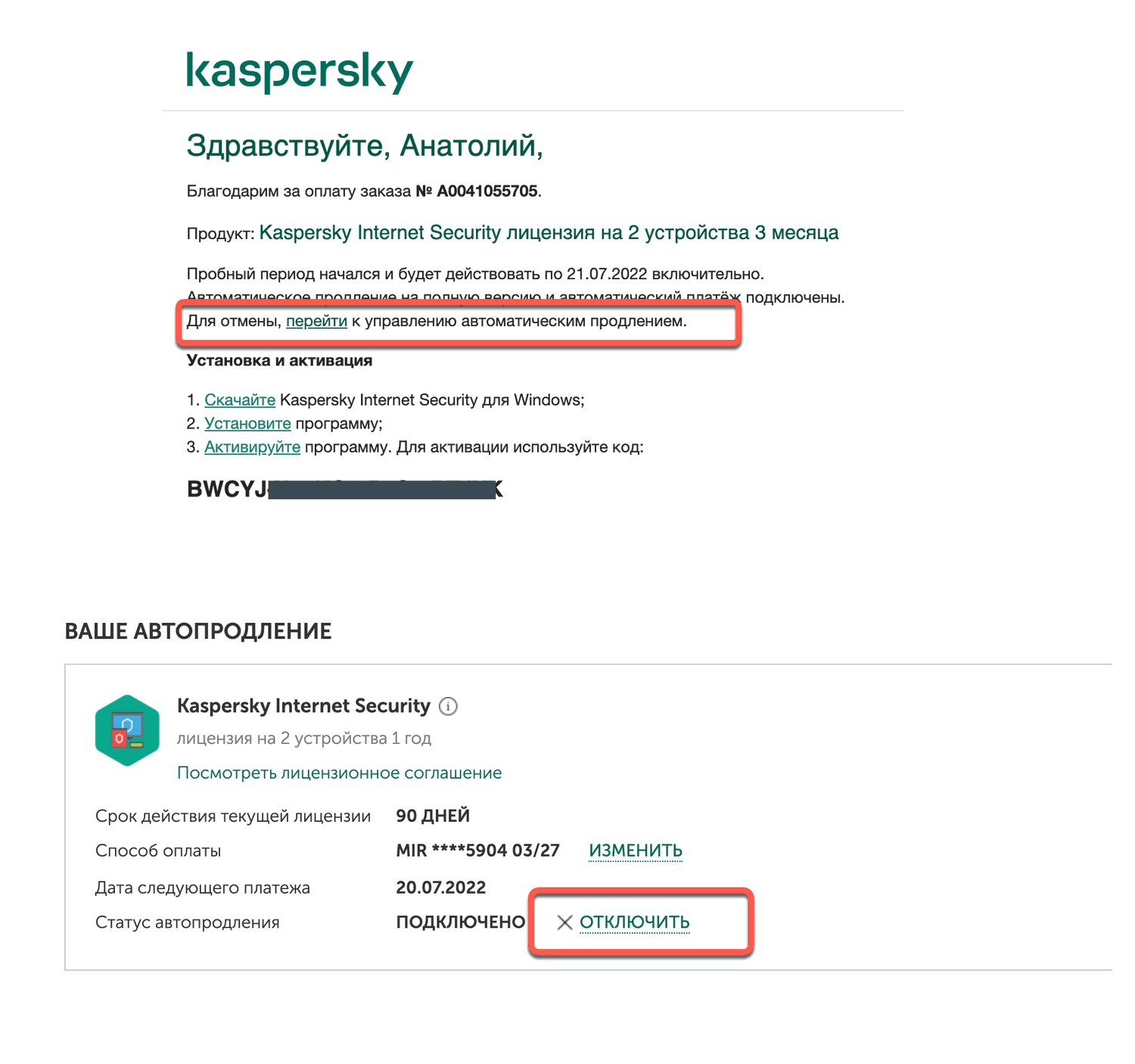 Для отмены автоматического платежа, перейдите к управлению автоматическим продлением по ссылке в полученном письме с лицензией и отключите автопродление.