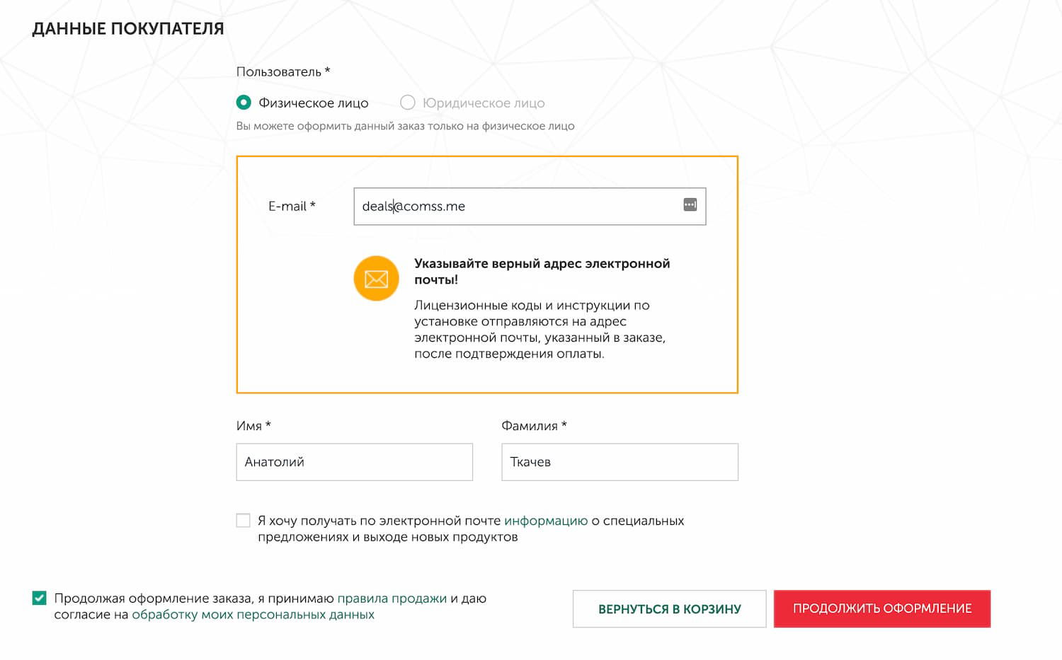 2. На открытой странице нажмите Подтвердить и заполните форму вашими данными. Укажите верный адрес электронной почты: лицензионные коды и инструкции по установке отправляются на адрес электронной почты, указанный в заказе, после подтверждения оплаты.