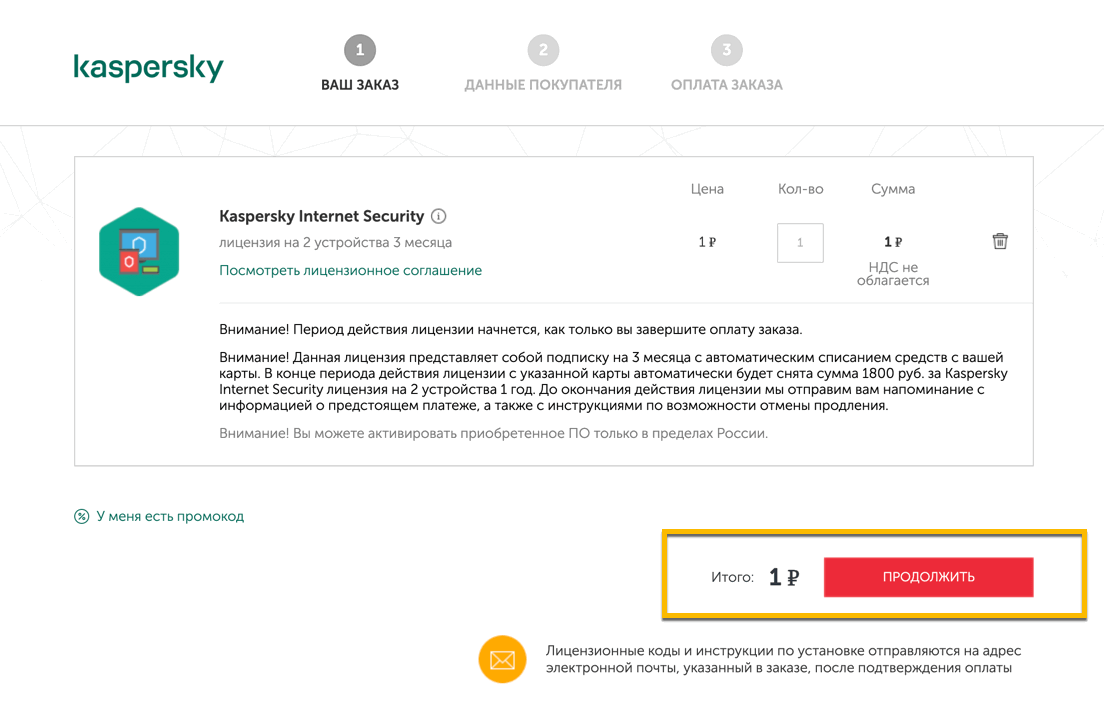 Чтобы получить бесплатную лицензию Kaspersky Internet Security для 2 устройств на 3 месяца (за 1 рубль) выполните следующие действия: