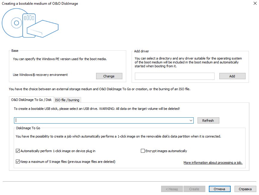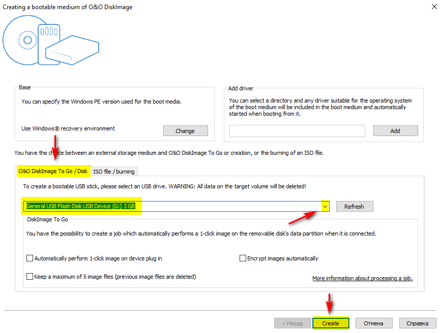 Если необходимо создать загрузочный USB накопитель, выбрать вкладку O&O DiskImage To Go / Disk, указать USB накопитель и нажать Create. По окончании процесса создания загрузочного накопителя нажать кнопку Готово.