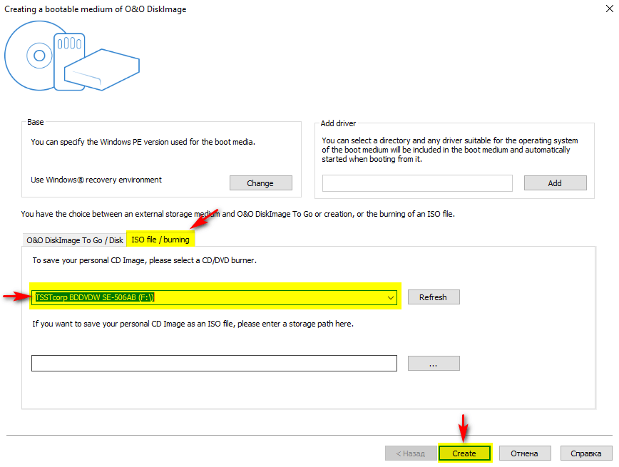 Если необходимо создать загрузочный CD/DVD диск, выбрать вкладку ISO file/burning, убедиться в наличии CD или DVD диска в приводе, при наличии нескольких приводов, выбрать нужный и нажать кнопку Create.