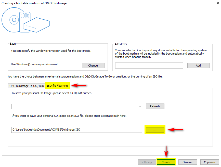 Если необходимо создать iso образ, который позднее можно записать на CD/DVD диск или USB накопитель, выбрать вкладку ISO file/burning, указать директорию для его сохранения, а также имя и нажать Create. По окончании процесса создания ISO образа нажать кнопку Готово.