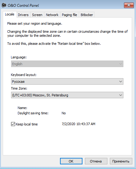- В окне O&O Control Panel если не требуется дополнительных настроек можно сразу нажать ОК или настроить определенные параметры, описанные ниже: