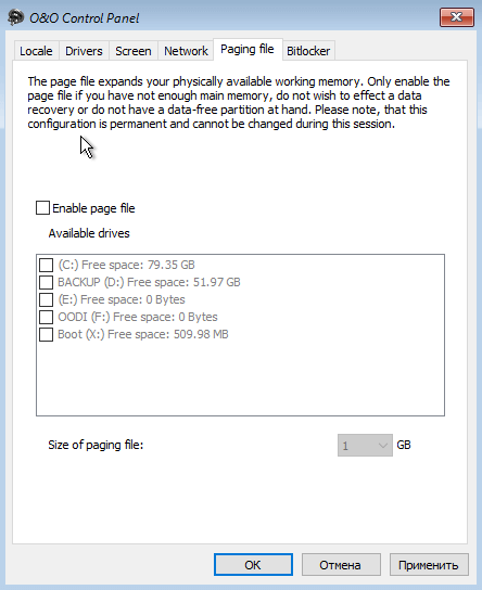 На вкладке Paging file при установке флажка в чекбоксе Enable page file можно выбрать область для размещения файла подкачки, а также размер. Файл подкачки выполняет стандартную функцию разгрузки оперативной памяти.