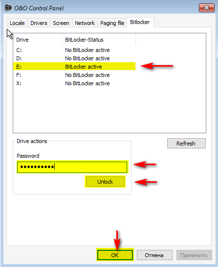 Если имеется зашифрованный раздел с использованием технологии BitLocker на вкладке Bitlocker можно указать пароль для разблокировки зашифрованного раздела для дальнейших манипуляций средствами O&O DiskImage 15 Pro.