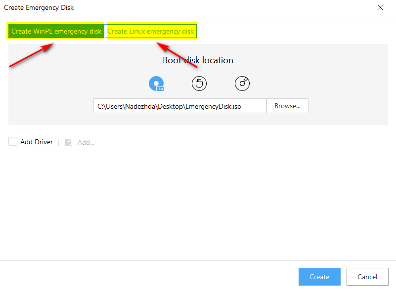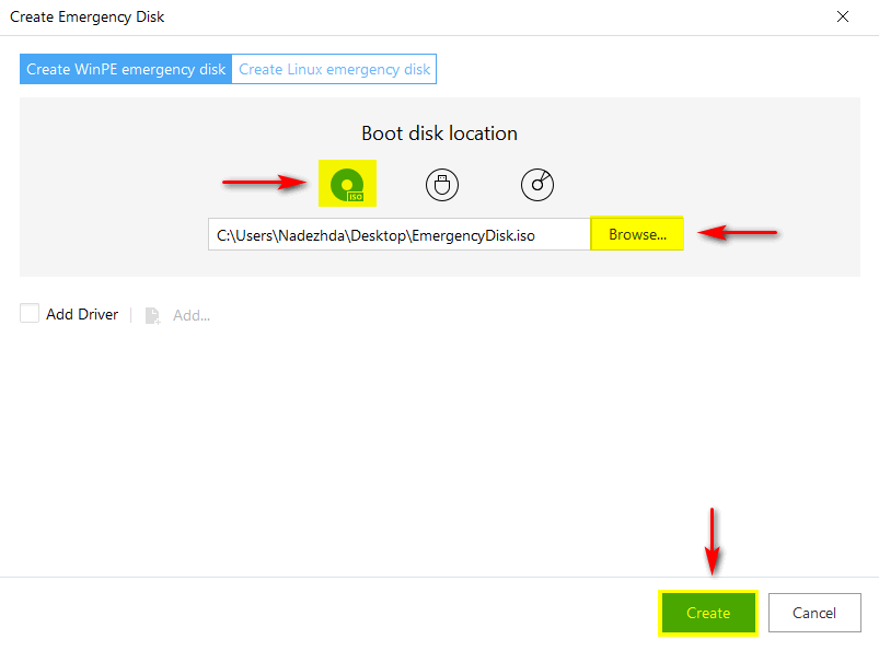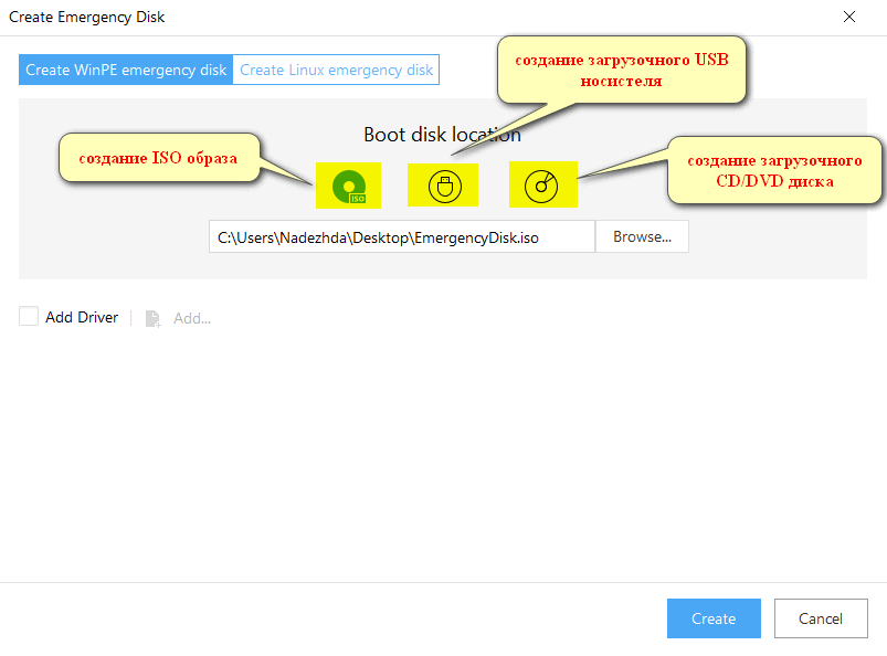 - Если выбран носитель на основе Windows PE, можно добавить драйвера, которые будут использованы при загрузке с носителя, установив флажок в чекбоксе Add Driver.