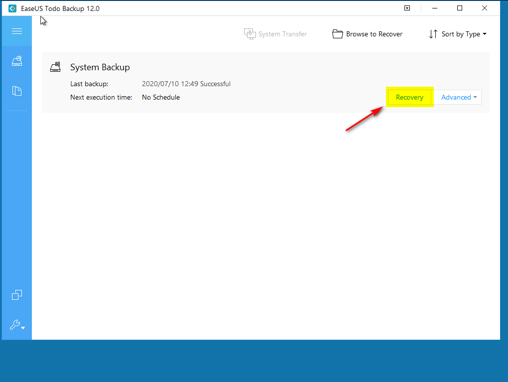 - В открывшемся окне EaseUS Todo Backup 12.0 выбрать резервную копию и нажать кнопку Recovery (восстановление) (Рис.8). Если резервная копия в стартовом окне отсутствует, можно вручную указать к ней путь, нажав кнопку Browse to Recover (Рис.9).