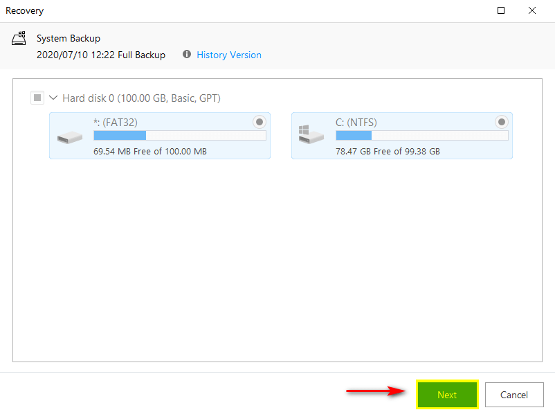 - Если необходимо указать версию резервной копии, которую необходимо восстановить, можно воспользоваться опцией History Version.