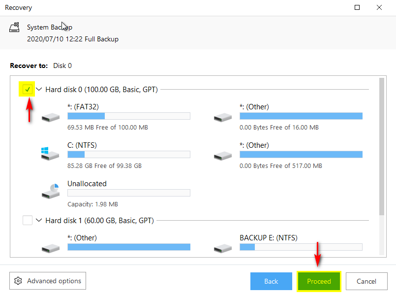- В следующем диалоговом окне выбрать, куда необходимо восстановить резервную копию и нажать кнопку Proceed, чтобы запустить процесс восстановления операционной системы.