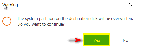 - В окне предупреждения о перезаписи системного раздела на диске назначения для продолжения операции нажать кнопку Yes.