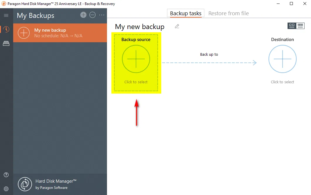 - Далее необходимо указать путь для сохранения образа резервной копии. В данном примере резервная копия будет создана в разделе backup второго жесткого диска. Для этого необходимо выбрать Destination в разделе Backup & Recovery.