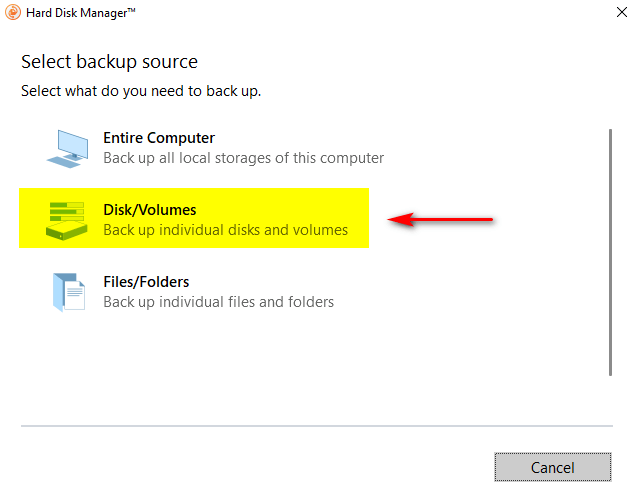 - В открывшемся диалоговом окне Select backup source необходимо указать, что нужно резервировать: все локальные диски компьютера (Entire Computer), определенные диски/разделы (Disk/volumes) или файлы/папки (Files/Folders). Для создания резервной копии системного раздела необходимо выбрать Disk/Volumes