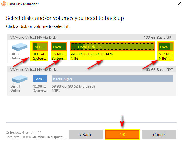 - В следующем диалоговом окне Select disk and/or volumes you need to back up необходимо выбрать системный раздел, в автоматическом режиме будут выделены необходимые скрытые разделы. В данном примере (Рис.9) имеется 3 скрытых раздела (раздел восстановления Windows – 517 Мб, MSR раздел - 16 Мб и шифрованный (EFI) раздел – 100 Мб). Нажать ОК.