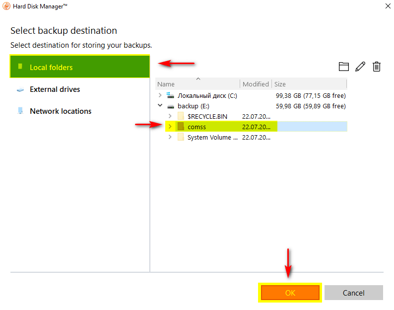 - В открывшемся диалоговом окне Select backup destination указать директорию для сохранения резервной копии. Можно указать путь к папке, расположенной на одном из разделом внутренних жестких дисков (Local folders), либо выбрать внешний накопитель (External drives), либо указать путь к сетевому ресурсу для сохранения резервной копии (Network locations).