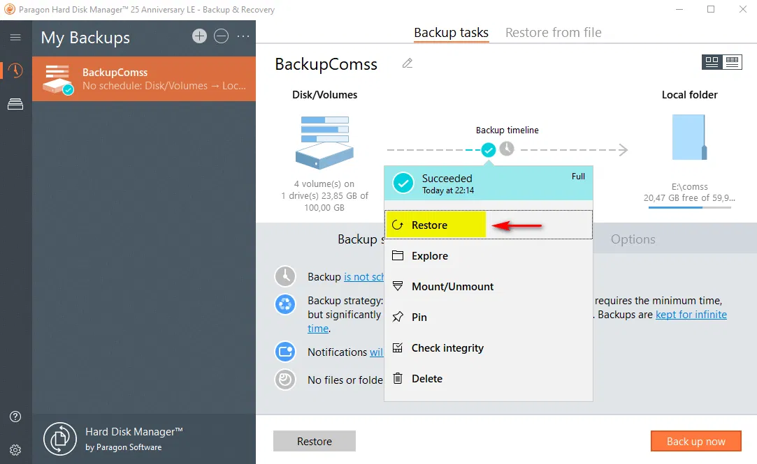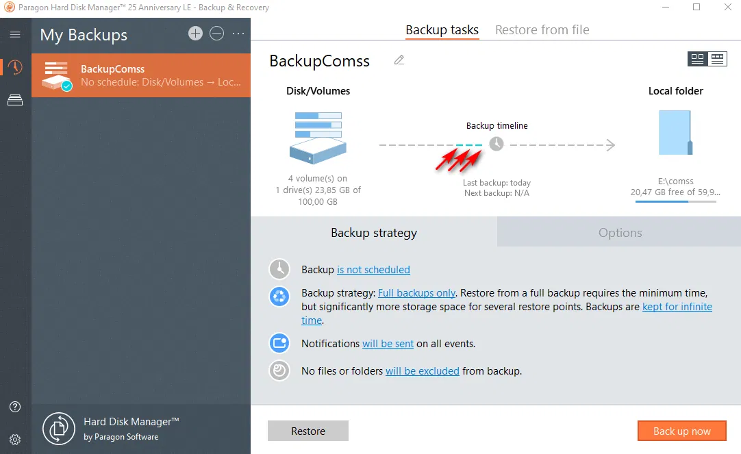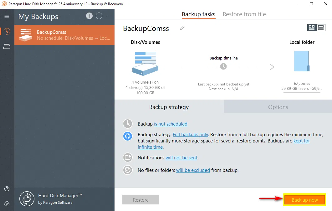 Если необходимо произвести тонкие настройки для создаваемой резервной копии, чтобы автоматизировать процесс резервного копирования, защитить данные резервной копии от несанкционированного доступа, можно настроить дополнительные параметры, выбрав вкладки Options или Backup strategy. Данные настройки описаны в статье Дополнительные параметры резервного копирования в программе Paragon Hard Disk Manager 25 Anniversary LE. Как правило, для большинства случаев подходят настройки по умолчанию.