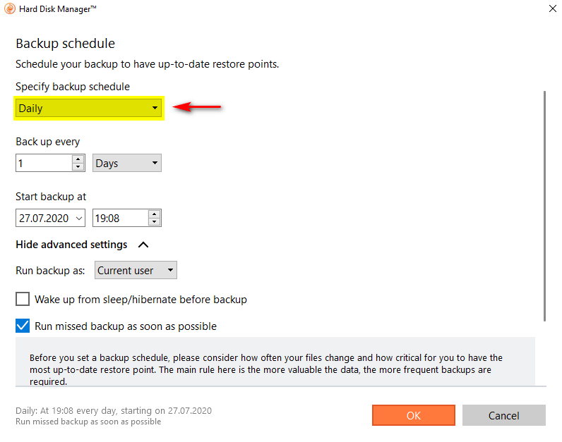 При выборе в раскрывающемся списке опции Daily, можно настроить ежедневное резервное копирование с указанием конкретного времени создания резервной копии. В разделе Back up every можно настроить периодичность создания резервной копии.