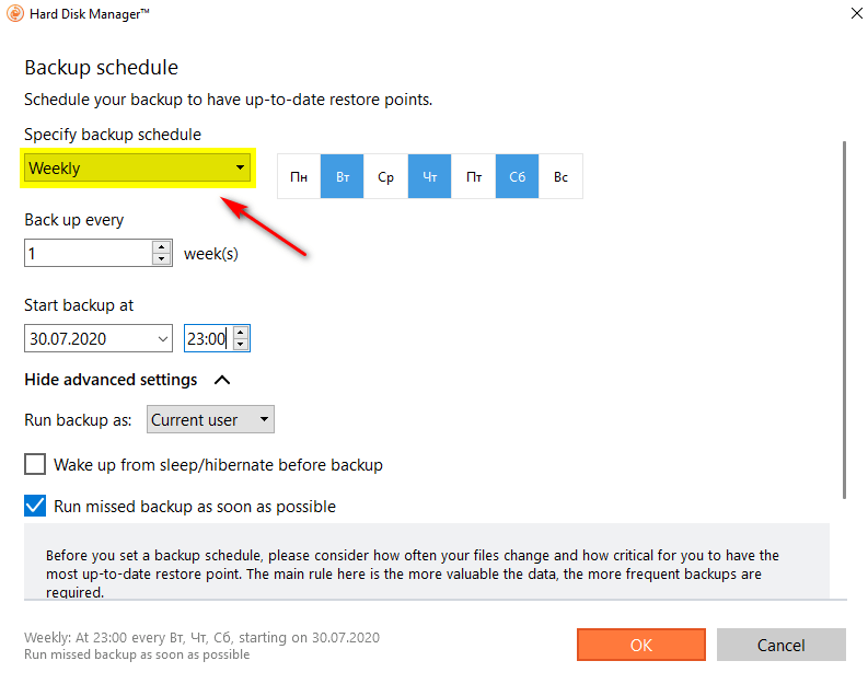 При выборе в раскрывающемся списке опции Weekly, можно настроить еженедельное резервное копирование с указанием конкретного времени создания резервной копии, а также дней недели. В разделе Back up every можно настроить периодичность создания резервной копии.