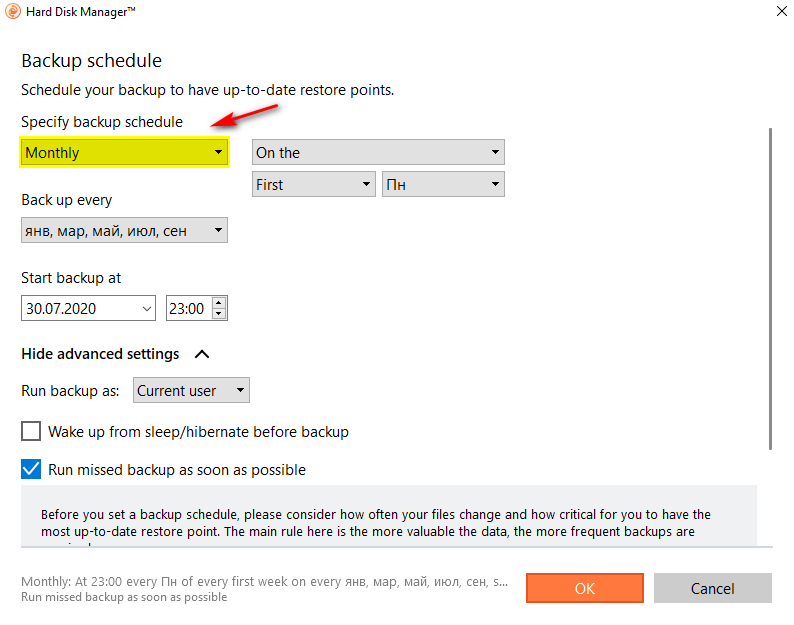 При выборе в раскрывающемся списке опции Monthly, можно настроить ежемесячное резервное копирование. В разделе Back up every можно указать конкретный(-е) месяц(-ы) создания резервной копии.