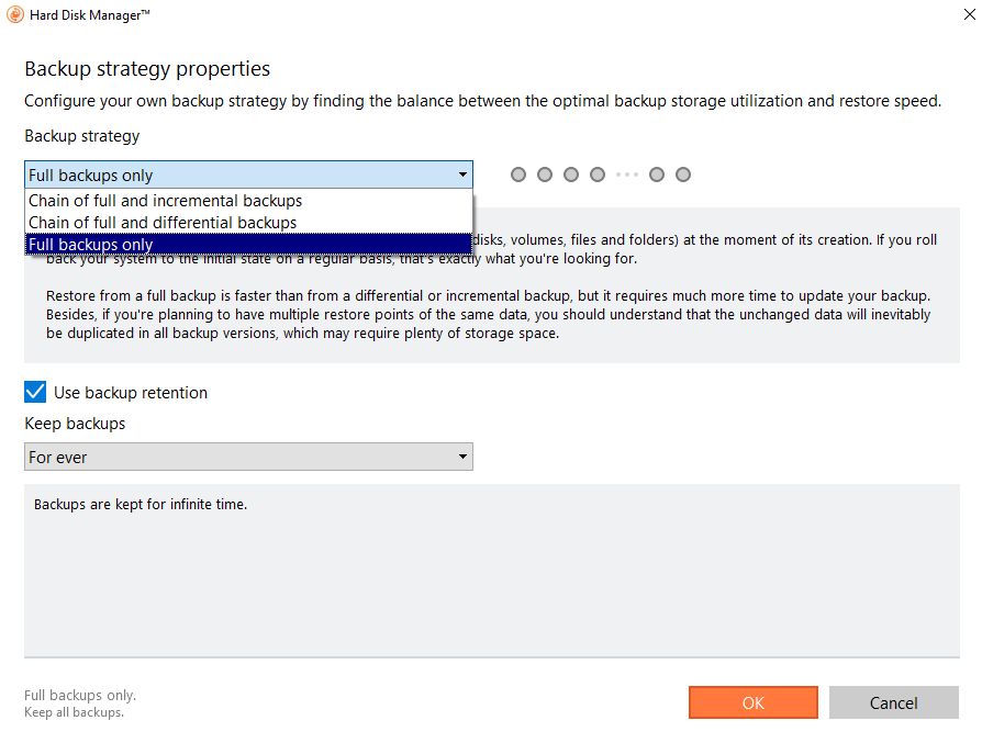 Также на вкладке Backup strategy можно настроить схему последующего резервного копирования, перейдя по гиперссылке Full backups only или Kept for infinite time для создания полной резервной копии, либо для выбора конкретной схемы резервного копирования.