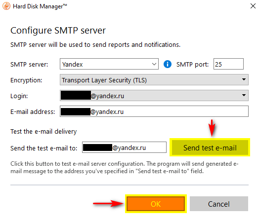 В зависимости от настроек почты, которая используется, настроить параметры в открывшемся окне Configure SMTP server. После ввода необходимых параметров протестировать систему уведомлений, нажав на кнопку Send test e-mail. Если были указаны верные настройки, на почту придет тестовое уведомление. В данном примере (Рис.11) используется почта Яндекс.