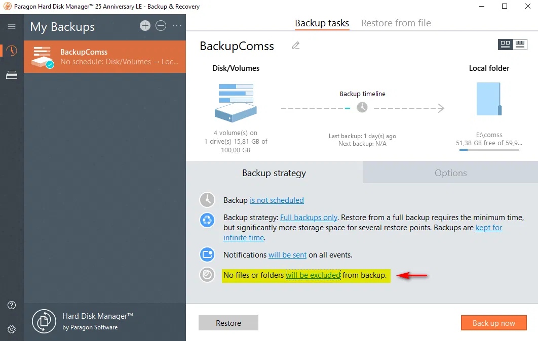 Перейдя по гиперссылке will be excluded на вкладке Backup strategy можно указать данные, которые не нужно резервировать, исключив определенные папки.