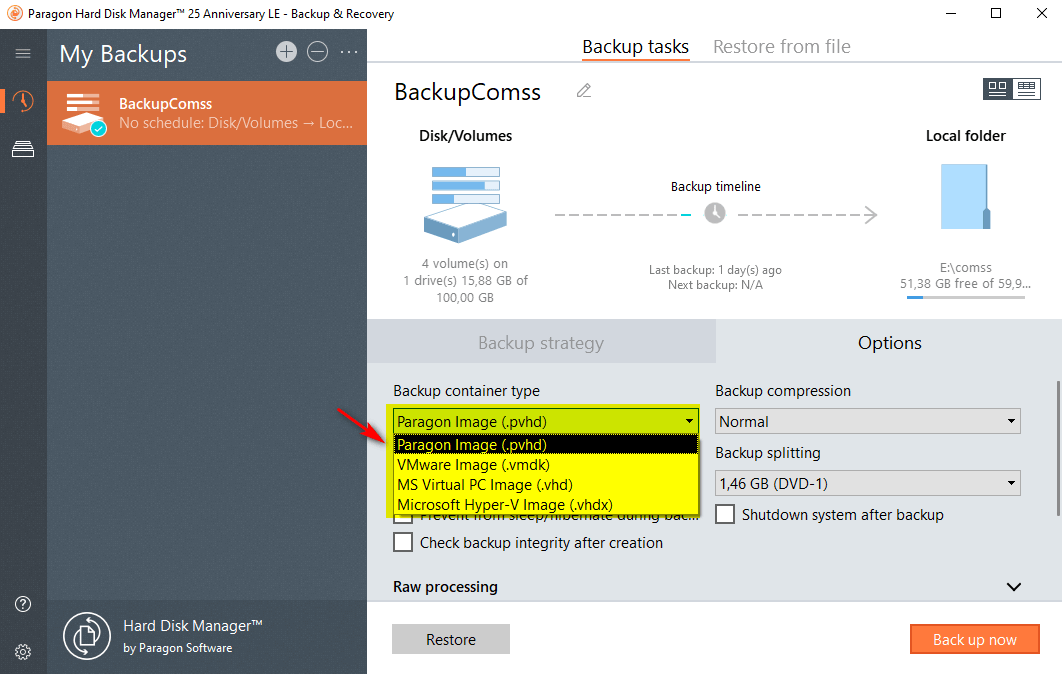 На вкладке Options в разделе Backup container type в раскрывающемся списке можно выбрать формат образа будущей резервной копии. По умолчанию сохраняется резервная копия в формате .pvhd (виртуальный жесткий диск Paragon), также доступны форматы VHD, VHDX и VMDK.