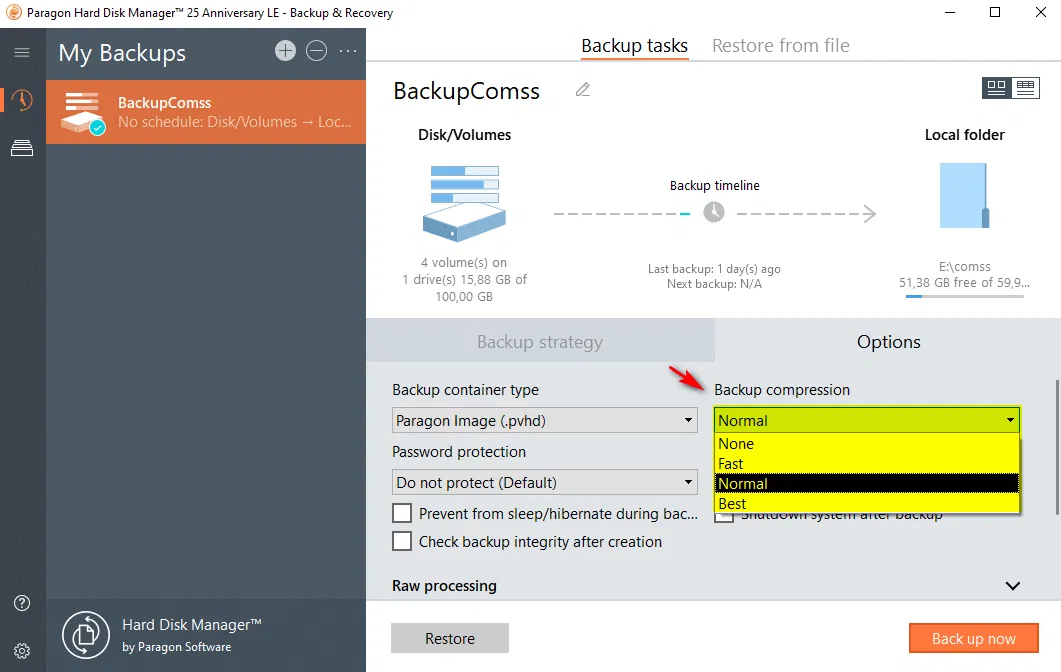 На вкладке Options в разделе Backup compression в раскрывающемся списке можно выбрать режим сжатия будущей резервной копии. По умолчанию используется средняя степень сжатия резервной копии. Данная опция поддерживается только для резервных копий формата .pvhd.