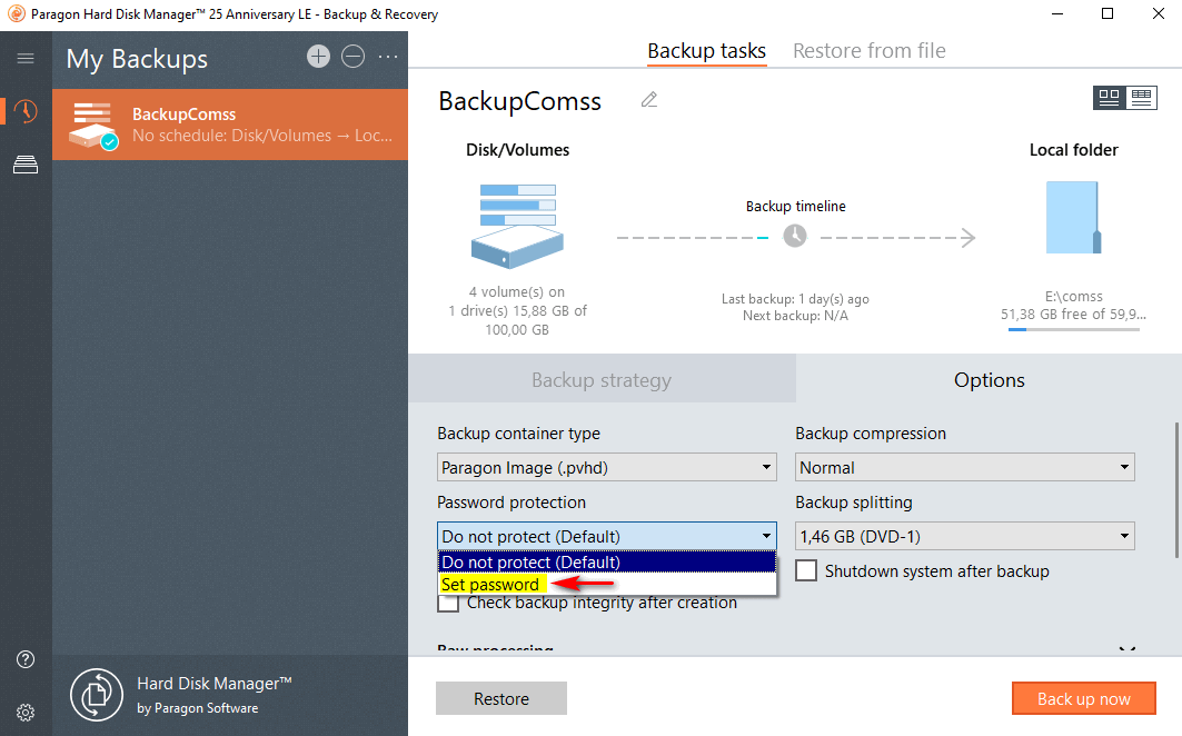Чтобы установить для резервной копии пароль для защиты от несанкционированного доступа, необходимо в раскрывающемся списке раздела Password protection выбрать Set password