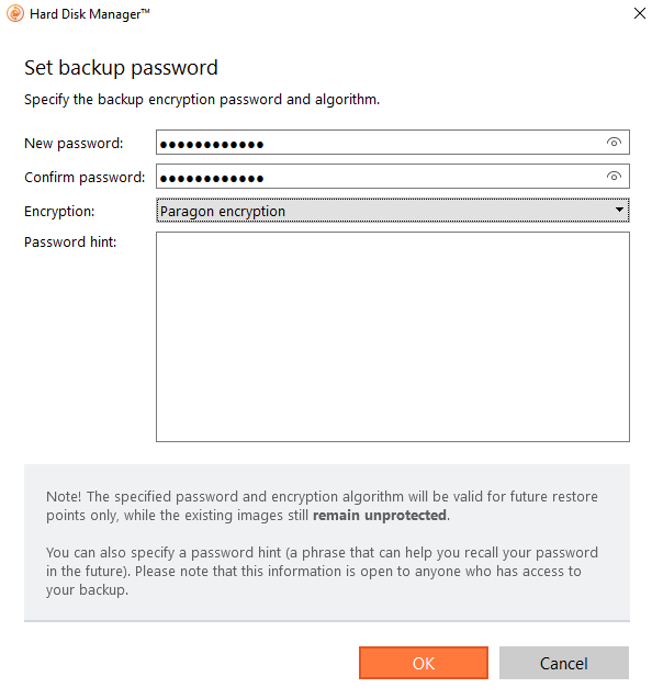 В открывшемся окне Set backup password ввести новый пароль, выбрать алгоритм шифрования и нажать ОК. Данная опция поддерживается только для резервных копий формата .pvhd.