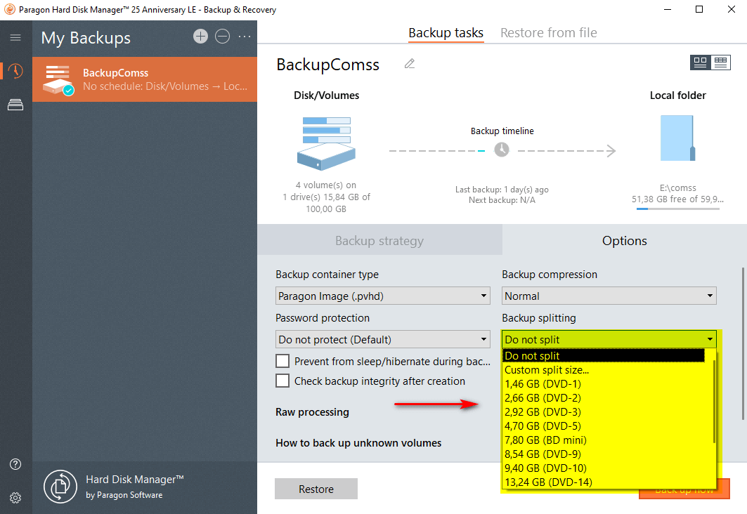 Файлы резервных копий можно разбить на несколько файлов меньшего размера, чтобы разместить их на нескольких носителей. Также это помогает избежать проблем, вызванных ограничением максимального размера файловой системы FAT32. В разделе Backup splitting можно указать другой размер или отключить разделение резервной копии на файлы определенного размера. Данная опция поддерживается только для резервных копий формата .pvhd.