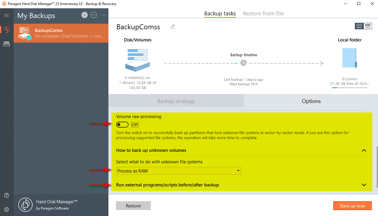 Опция Raw processing позволяет настроить поведение программы при обработки малораспространённых типов разделов. При активировании данной опции в раскрывающемся списке How to back up unknown volumes можно выбрать следующее: