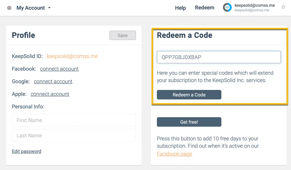 Активировать код в аккаунте KeepSolid ID