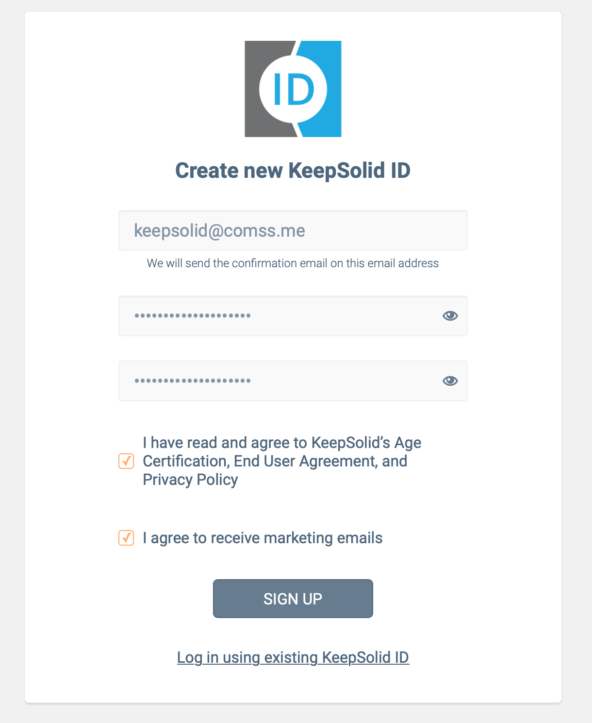 - Создайте новый KeepSolid ID (или используйте существующий аккаунт) на официальном сайте и подтвердите вашу учетную запись по электронной почте.