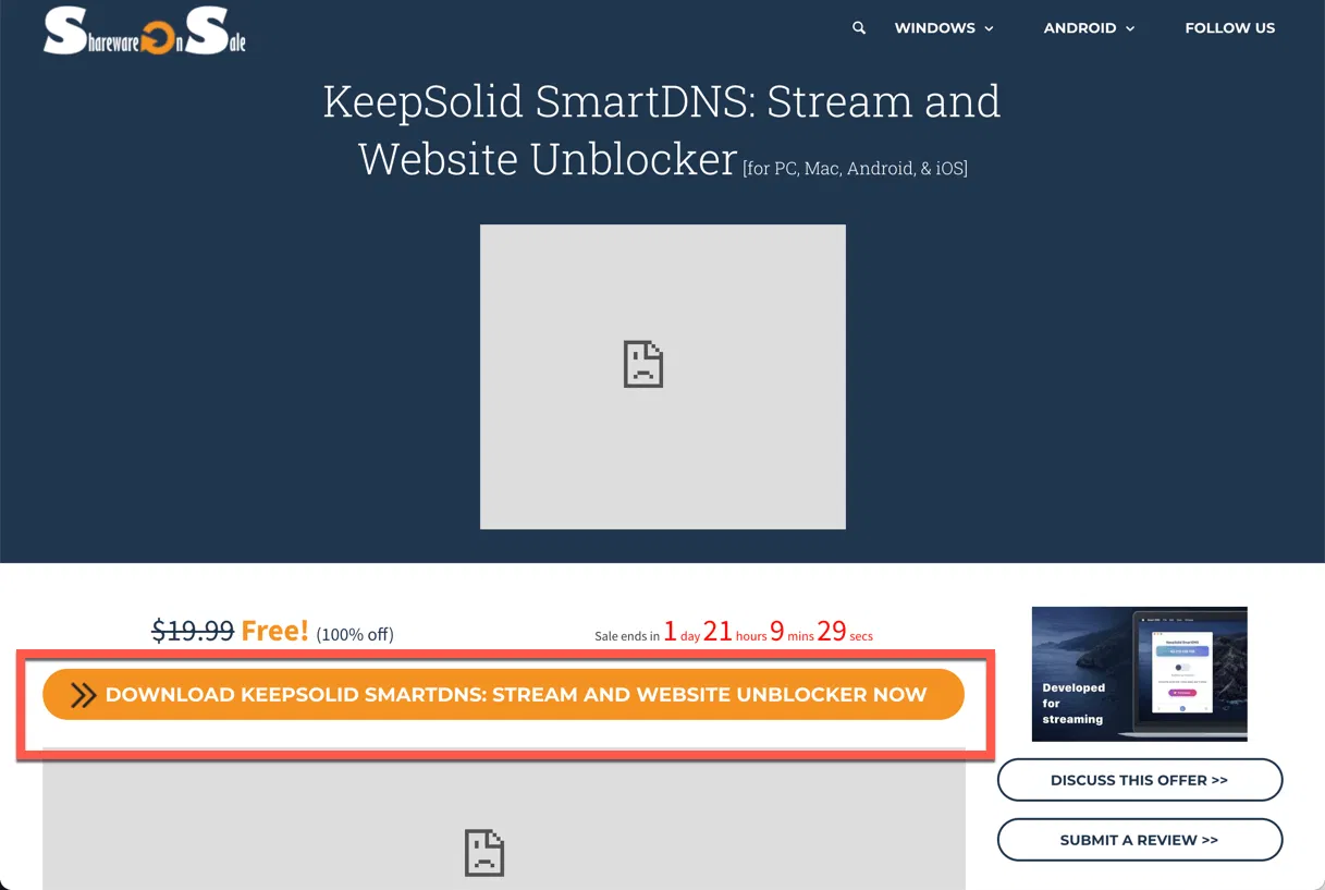 - Перейдите на страницу промо-акции (на английском языке) и нажмите кнопку DOWNLOAD KEEPSOLID SMARTDNS: STREAM AND WEBSITE UNBLOCKER NOW.