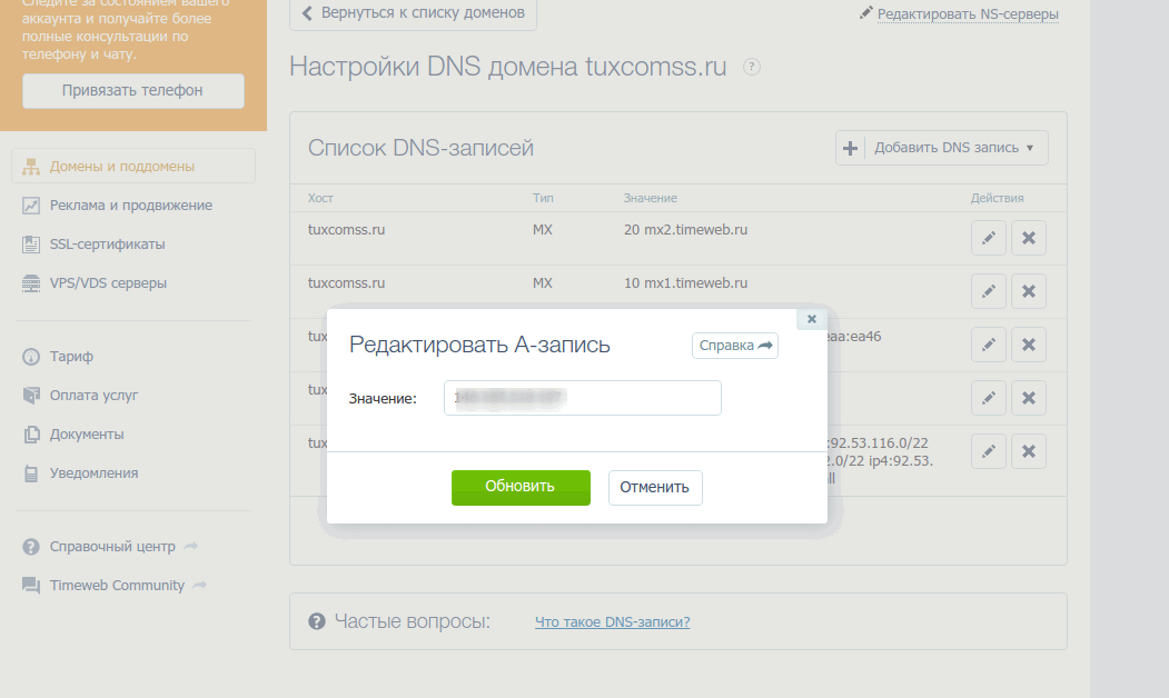 В настройках DNS (А-запись) учетной записи регистратора доменного имени не забудьте добавить IP-адрес сервера.