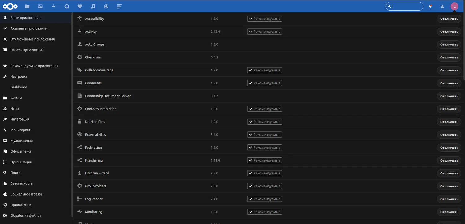 В NextCloud доступно огромное количество приложений для расширения функциональности.