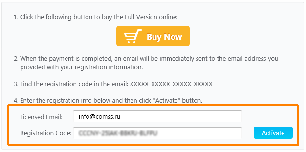 2. В меню Register (внизу справа) введите свою электронную почту и ключ активации, а затем нажмите "Activate":