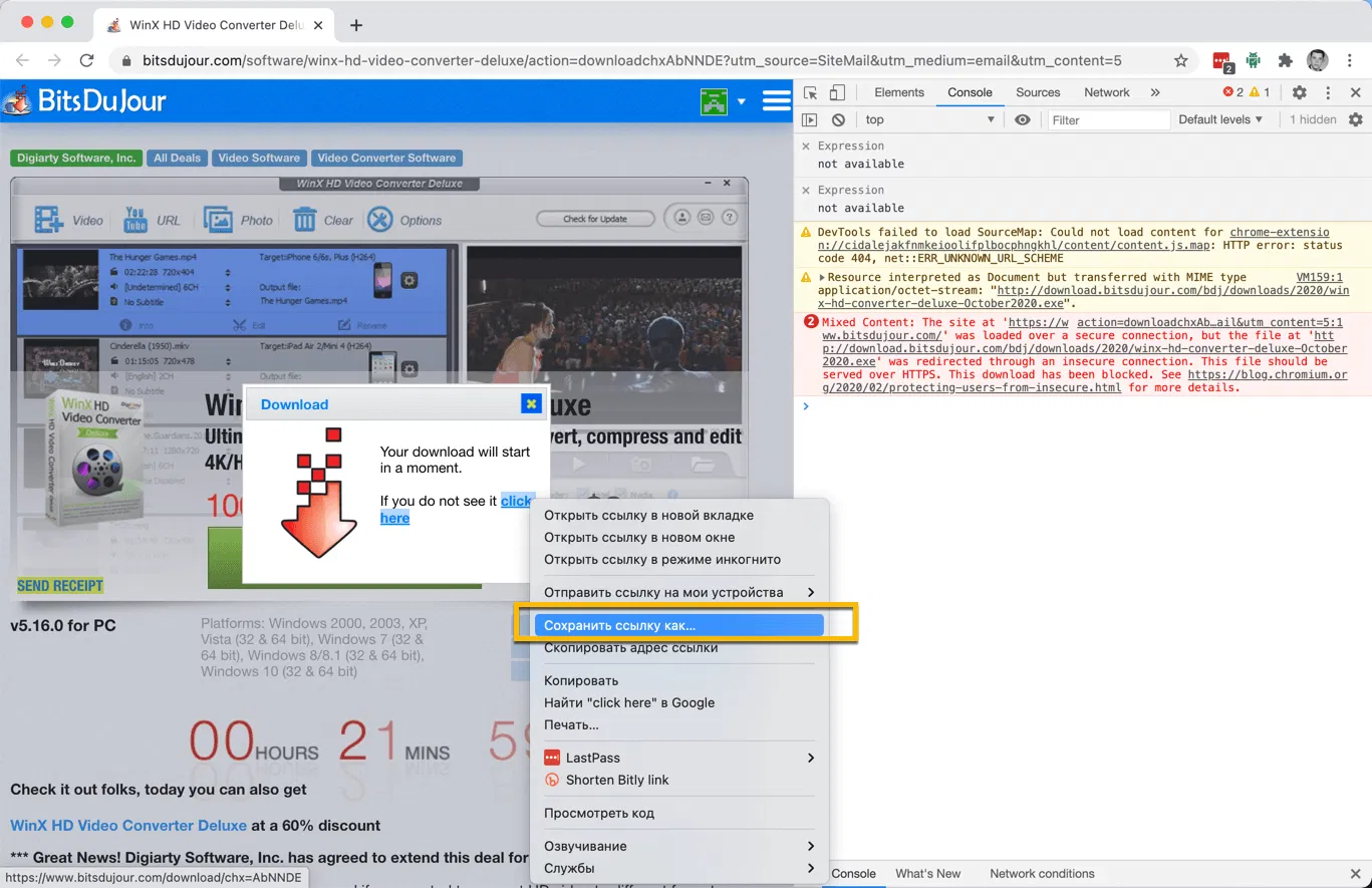 The site at <имя сайта с HTTPS> was loaded over a secure connection, but the file at <адрес файла с HTTP> was redirected through an insecure connection. This file should be served over HTTPS. This download has been blocked.