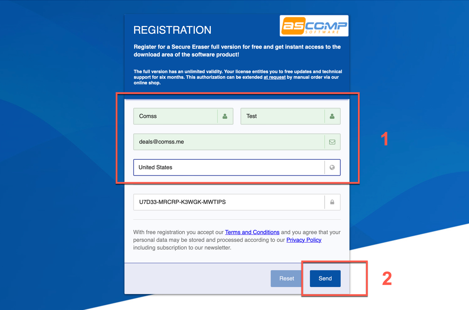 Для получения бесплатной лицензии ASCOMP Secure Eraser Professional выполните следующие действия: